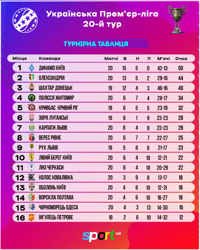 Топ-7 УПЛ: Динамо Киев (50), Александрия (44), Шахтер (40), Полесье (34), Кривбасс (32), Заря, Карпаты (по 28).