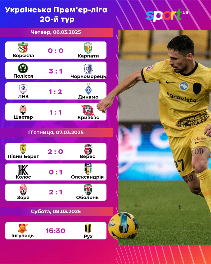 С 6 по 8 марта проходят поединки 20-го тура Украинской Премьер-лиги 2024/25.