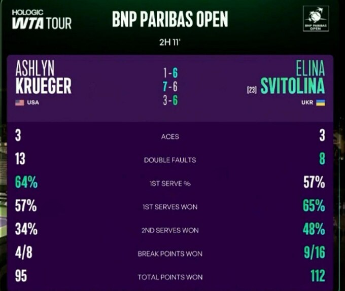 Svitolina defeats Krueger 6-1, 6-7(8), 6-3.#TennisParadise pic.twitter.com/1KMB6x141I