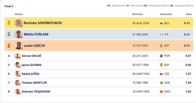 В последней попытке болгарин показал результат 8.13 м. И на 1 сантиметр обогнал соперников. Это стало реваншем в борьбе итальянца и болгарина. На юниорском чемпионате Европы 2023 года итальянец был сильнее, тоже с разницей в один сантиметр.