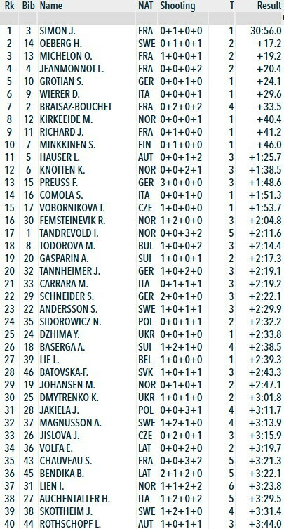 Французская биатлонистка Жюлья Симон заняла первое место в персьюте и оформила 21 победу на уровне Кубков мира. В течение гонки спортсменка только однажды не попала в мишень. Второй в гонке преследования стала Анна Эберг из Швеции, которой не хватило 17.2 секунды, чтобы зацепиться за триумф. Другая биатлонистка сборной Франции Осеан Мишлон финишировала третьей, имея в активе два штрафных круга.