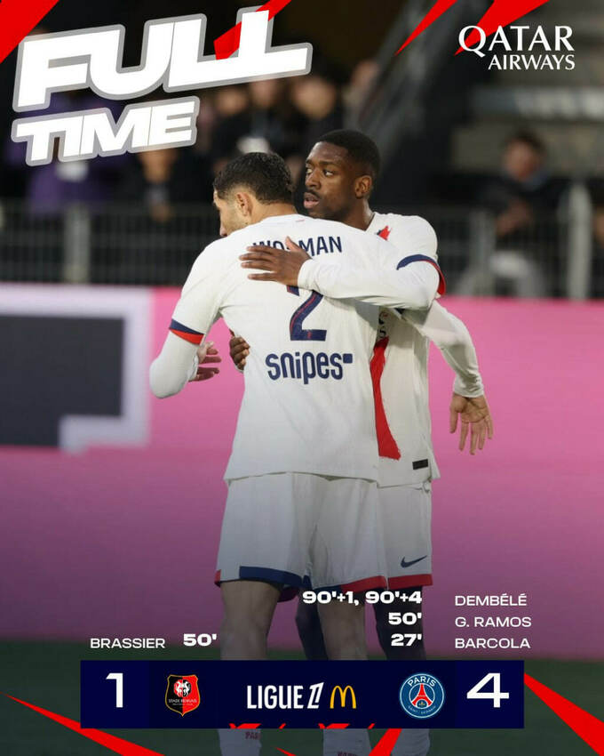 Голами за ПСЖ отличились Брэдли Баркола, Гонсалу Рамуш и Усман Дембеле (дубль). У Баркола также ассист на Гонсалу.