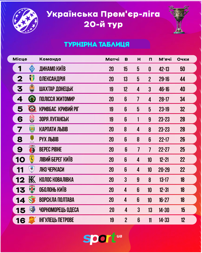 Топ-8 УПЛ: Динамо Киев (50), Александрия (44), Шахтер (40), Полесье (34), Кривбасс (32), Заря, Карпаты (по 28), Рух (26).