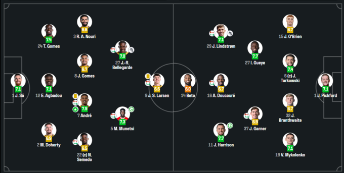 Украинский защитник «Эвертона» Виталий Миколенко провел на поле весь матч, результативными действиями не отличился. Статистический портал SofaScore оценил игру украинца в 7.1 баллов из 10 возможных, WhoScored дал Виталию 6.9 баллов. Лучшим по версии SofaScore стал полузащитник хозяев поля Андре с оценкой 7.9. WhoScored выделил вингера гостей Джека Харрисона, на счету которого гол и оценка 7.9.