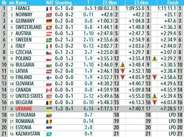 Без всяких сомнений первую строчку в гонке заняла сборная Франции, лидировавшая в эстафете, начиная с первого огневого рубежа. Второй стала сборная Норвегии, использовавшая 11 запасных патронов. Тройку замкнула немецкая команда.