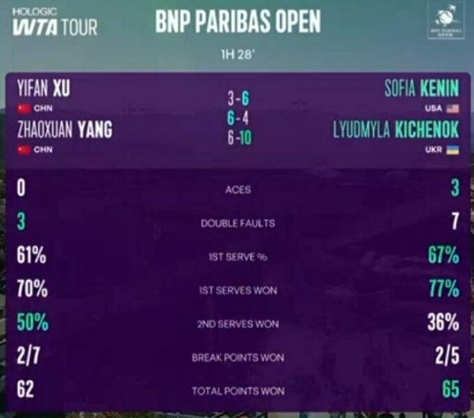 Киченок и Кенин проводят третий совместный турнир. На двух предыдущих украинско-американский дуэт не сумел выиграть ни одного матча, а на И-У – уже два. В 1-м раунде Людмила и София прошли Александру Панову и Эну Шибахару.
