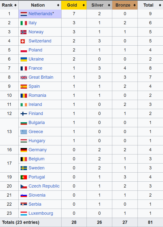 Украина с двумя золотыми наградами финишировала на шестом месте в медальном зачете, а вообще награды завоевали представители 23 стран.