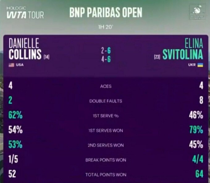 Bringing the HEAT to the desert! 🔥@ElinaSvitolina defeats Collins in straight sets 6-2,6-4 and will face Pegula for a spot in the quarterfinal. #TennisParadise pic.twitter.com/G8v4wFBHuD