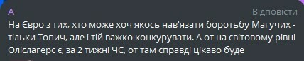 А: На Евро из тех, кто может хоть как-то навязать борьбу Магучих – только Топич, но и трудно конкурировать. А вот на мировом уровне Олислагерс есть, через 2 недели ЧМ, вот там действительно интересно будет.