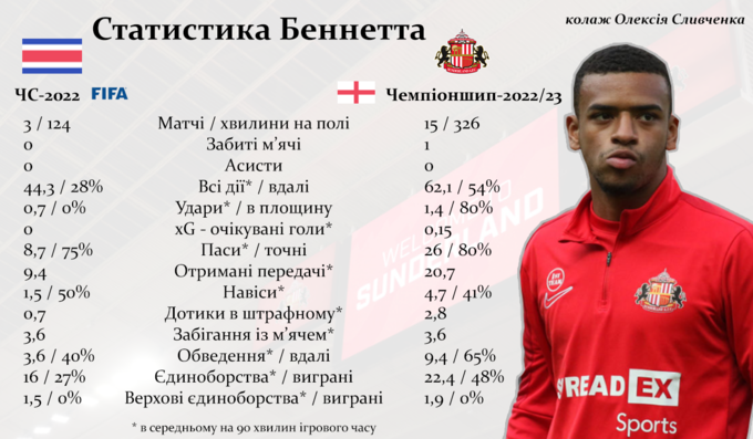 К слову, о статистике. Мы специально привели наиболее репрезентативные данные для Беннетта, которые существуют на текущий момент. С одной стороны – это выступление на чемпионате мира, которое более чем односложно раскрывает способности практически любого футболиста. С другой – его игры в Чемпионшипе-2022/23, когда он еще более-менее регулярно объявлялся в составе «Сандерленда».