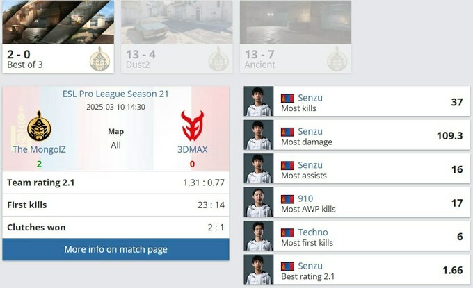 The MongolZ вышли в плей-офф ESL Pro League Season 21 после разгрома 3DMAX на Dust2 (13:4) и Ancient (13:7).