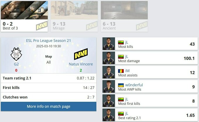 Natus Vincere гарантировали себе место в плей-офф ESL Pro League Season 21 с результатом 2:0, одолев G2 на двух картах (Mirage 13:9, Ancient 13:6).