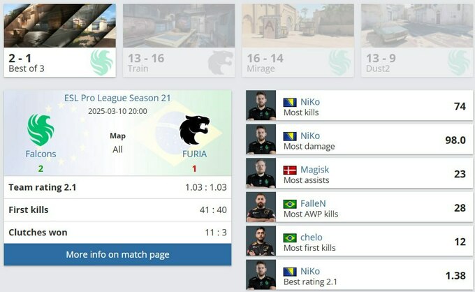 Falcons выбили FURIA из второго этапа ESL Pro League Season 21 после напряженной серии на трех картах (13:16 Train, 16:14 Mirage, 13:9 Dust2).