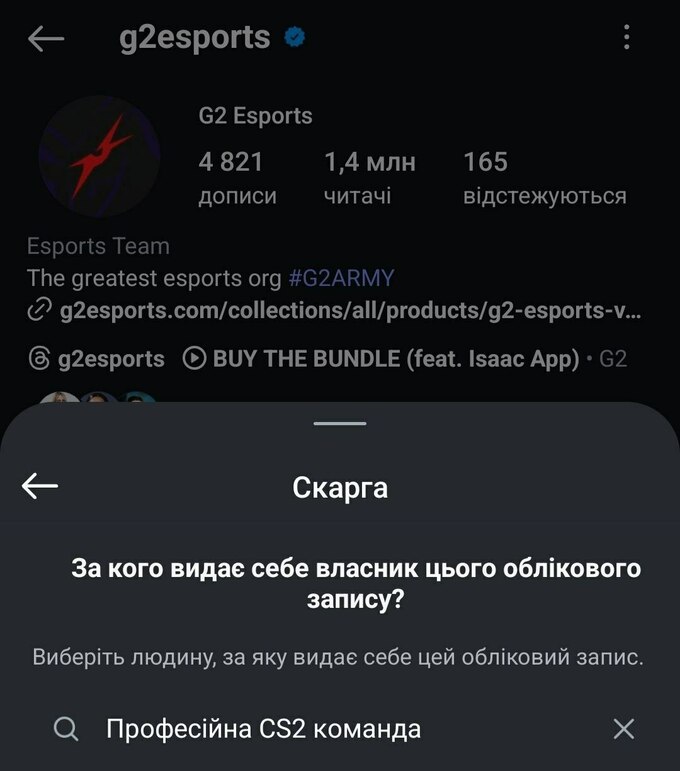 Natus Vincere решили подшутить над фанатами G2 Esports после своей победы. В соцсетях украинский клуб опубликовал забавный скриншот, где якобы отправляет жалобу на аккаунт соперников, обвиняя их в том, что они «выдают себя за профессиональную команду».