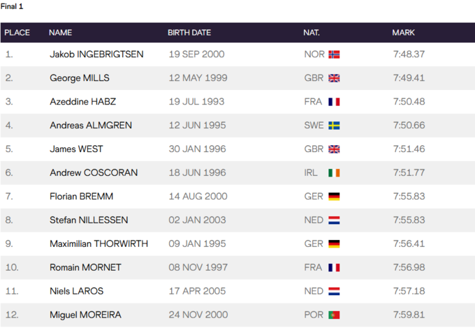 - Якоб Ингебригтсен (Норвегия) – 7:48.37 минут