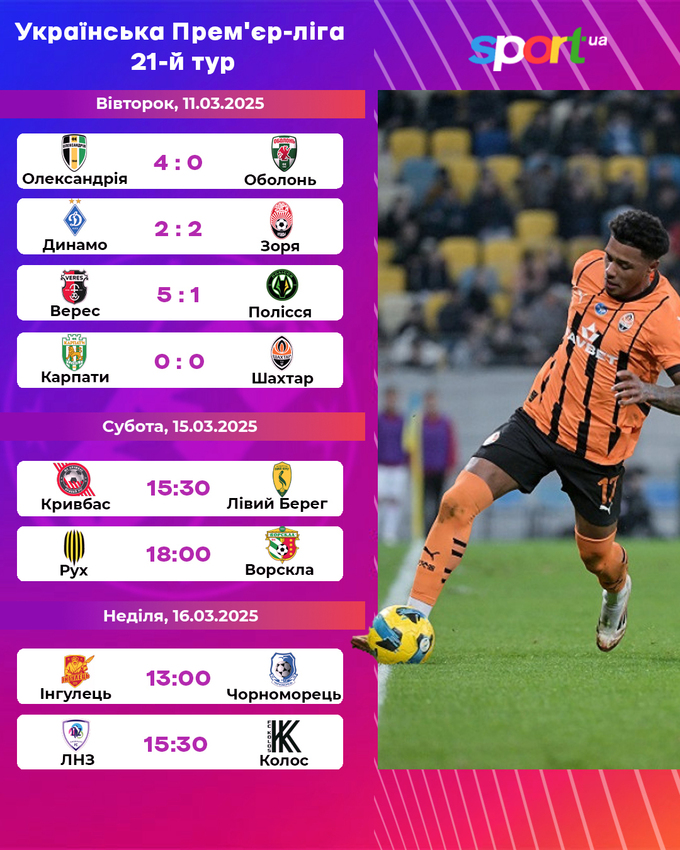 11 марта прошли поединки 21-го тура Украинской Премьер-лиги 2024/25.