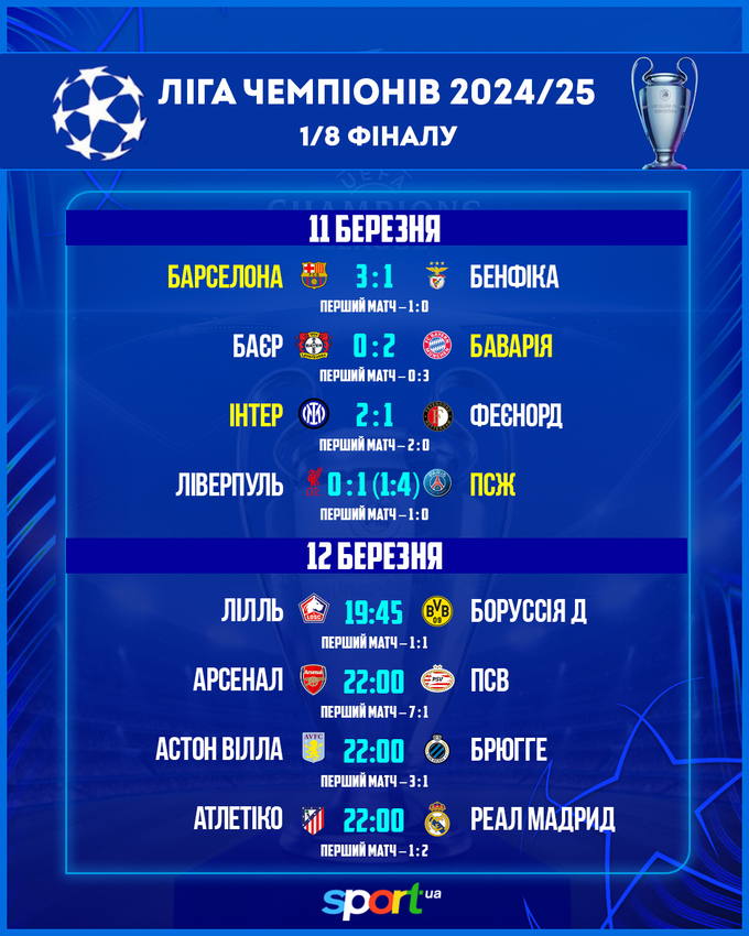 Вечером 11 марта состоялись ответные поединки 1/8 финала Лиги чемпионов УЕФА 2024/25.