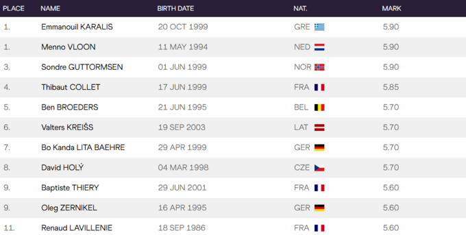 Сразу три прыгуна: Эммануил Каралис (Греция), Менно Влон (Нидерланды), Сондре Гуттормсен (Норвегия), показали одинаковый результат - 5.90 метров. Однако по попыткам норвежец оказался на третьей ступеньке пьедестала. В борьбе за золото невозможно было определить единого победителя. И Каралис, и Влон имели одинаковое количество попыток.