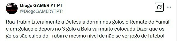 Diogo GAMER YT PT: Защита спит на воротах Удар Ямала и отличный гол, а затем в 3-й гол мяч очень поставлен Сказать, что голы – это ошибка Трубина, и это то же, что не смотреть футбольный матч.