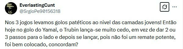 EverlastingCunt: В 3 матчах мы пропустили жалкие голы на молодежном уровне! Сегодня при голе Ямала Трубина слишком рано бросился, вместо того, чтобы сделать 2-3 шага в сторону и потом броситься, потому что это был не мощный удар, он был удачен, согласны?