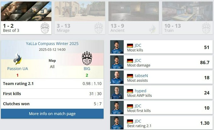 Лучшим игроком в матче против Passion UA стал JDC из BIG, который набрал 51 фраг, нанес 86.7 урона за раунд и имел рейтинг 1.30.