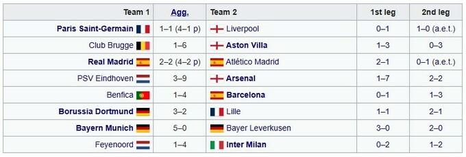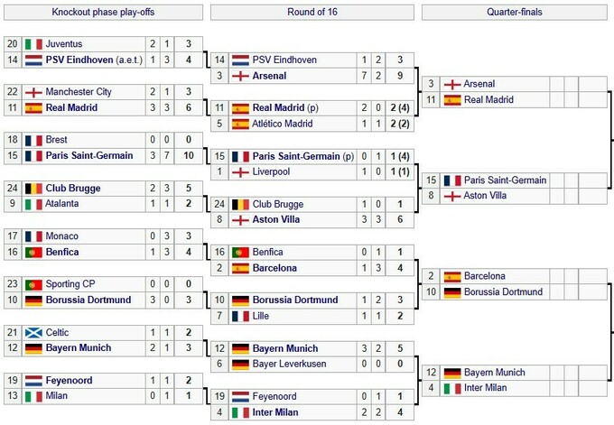 В 1/4 финала сыграют: ПСЖ – Астон Вилла, Арсенал – Реал Мадрид, Барселона – Боруссия Дортмунд, Бавария – Интер.
