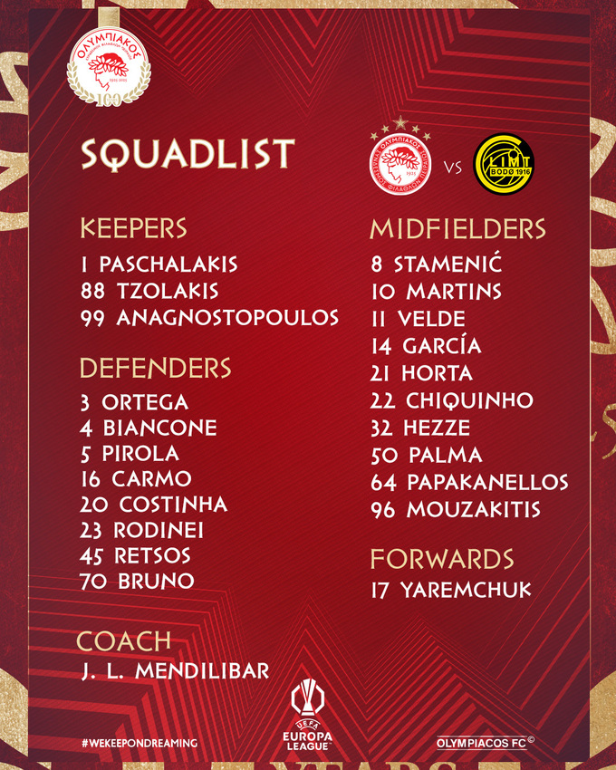 Заявка Олимпиакоса на ответный поединок Лиги Европы: