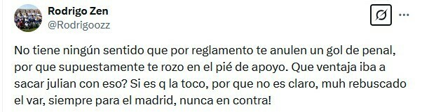 Rodrigo Zen: Глупо, что регламентом отменяют гол с пенальти, потому что он якобы задел твою опорную ногу. Какое преимущество должен получить Хулиан? вар очень надуманный, всегда за Мадрид, никогда против него!