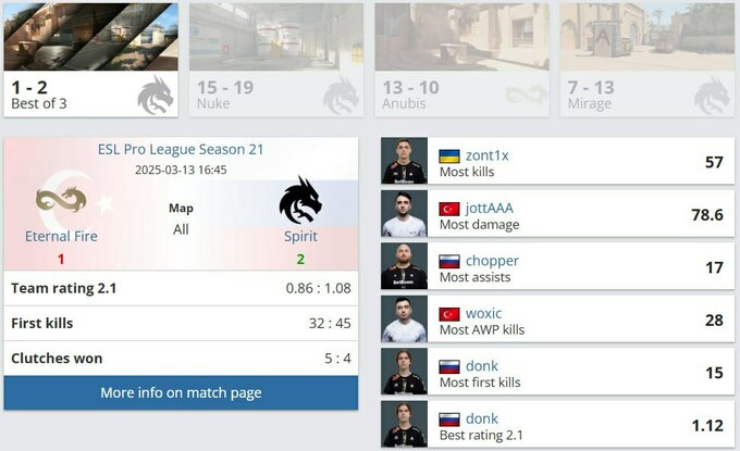Команда Spirit одержала победу в напряжённой трёхкарточной битве против Eternal Fire, обеспечив себе место в полуфинале ESL Pro League Season 21.