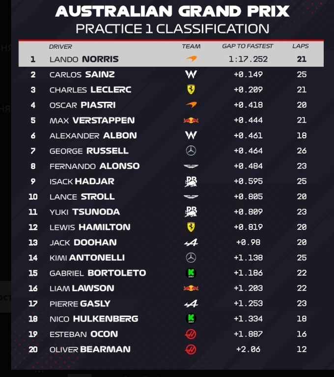 В первой тренировке темп ожидаемо задавал пилот Макларена Ландо Норрис, который показал лучшее время, опередив Карлоса Сайнса на Уильямсе и Шарля Леклера на Феррари.