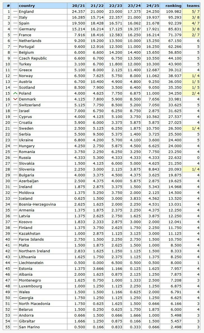 Польша впервые в истории обеспечила себе 15-е место в таблице коэффициентов, что позволит ей выставить две команды в Лигу чемпионов сезона 2026/27. Это самый лучший результат страны в еврокубковом рейтинге с 1980 года.