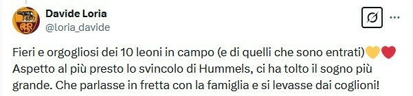 Davide Loria: Горжусь 10 львами на поле (и вышедшими). Я жду скорейшей развязки с Хуммельсом, он забрал нашу величайшую мечту. Пусть поговорит с семьей и прочь!