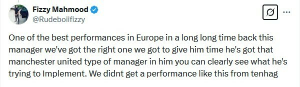 Fizzy Mahmood: Одно из лучших выступлений в Европе за долгое-долгое время, этот менеджер у нас есть правильный, мы должны дать ему время, у него есть тот тип менеджера Манчестер Юнайтед, вы можете ясно видеть, что он пытается реализовать. Мы не получили такого выступления от Тен Хага.