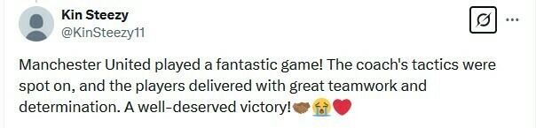 Kin Steezy: Манчестер Юнайтед сыграли фантастическую игру! Тактика тренера была точной, а игроки показали отличную командную работу и решимость. Заслуженная победа!
