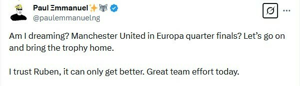 Paul Ξmmanuel: Мне снится? «Манчестер Юнайтед» в четвертьфинале Европы? Давайте продолжим и привезем трофей домой. Я верю Рубену, дальше будет только лучше. Отличная командная работа сегодня.