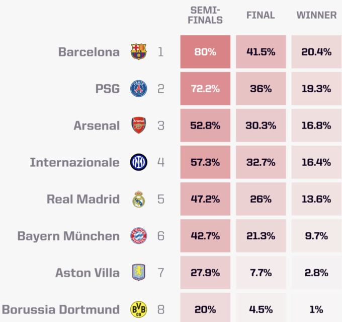 Больше всего шансов на победу Opta дал «Барселоне» – 20.4%. Далее в списке идет «ПСЖ» (19.3%) и «Арсенал» (16.8%). Мадридский «Реал» идет в списке лишь пятым с 13.6%.