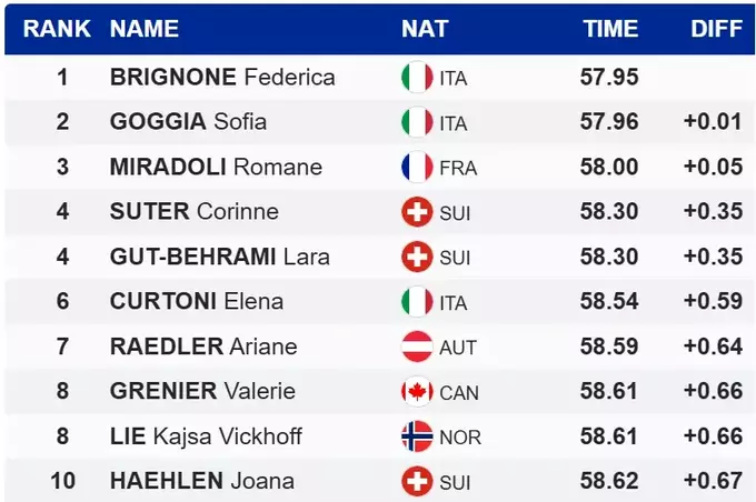 Перед собственной публикой победу оформила итальянка Федерика Бриньоне, которая на предыдущем соревновании заняла третье место. Благодаря такому выступлению спортсменка перехватила красный боб лидера зачета Кубка мира в супергиганте.