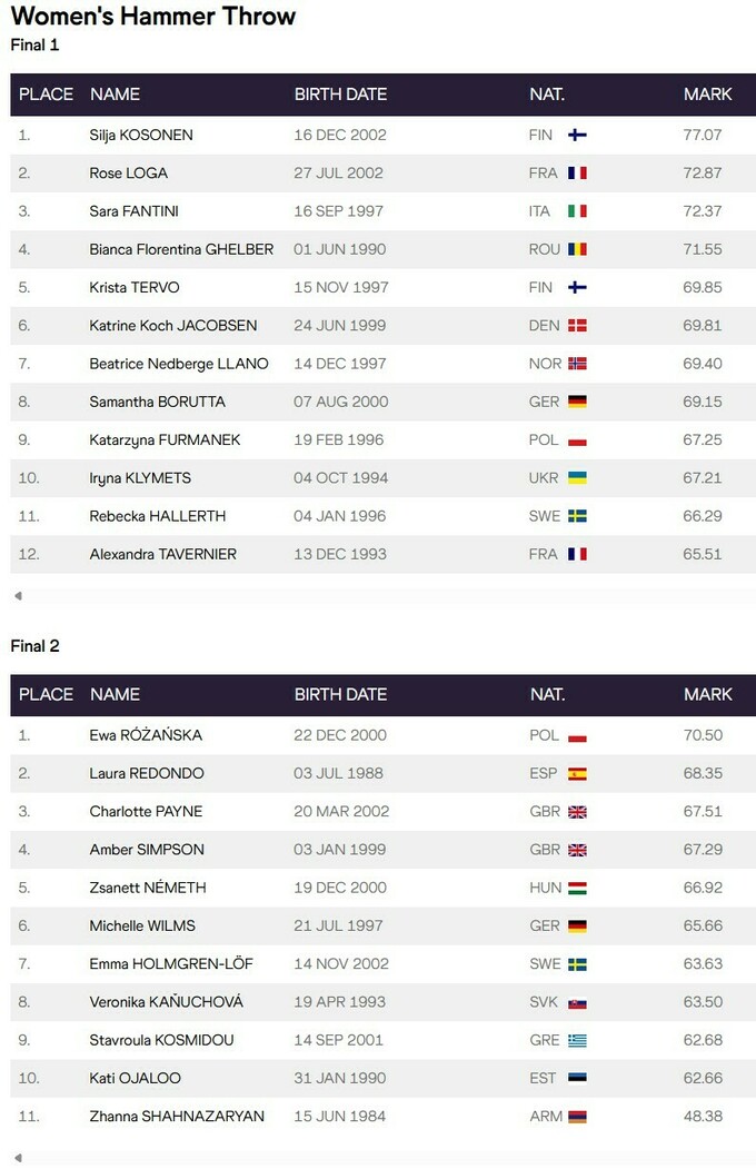 С лучшим результатом сезона в мире победила, атлетка Силя Косонен (Финляндия) – 77.07 м. Второе место заняла Роза Лога из Франции – 72.87 м. Бронзу завоевала итальянка Сара Фантини – 72.37 м.
