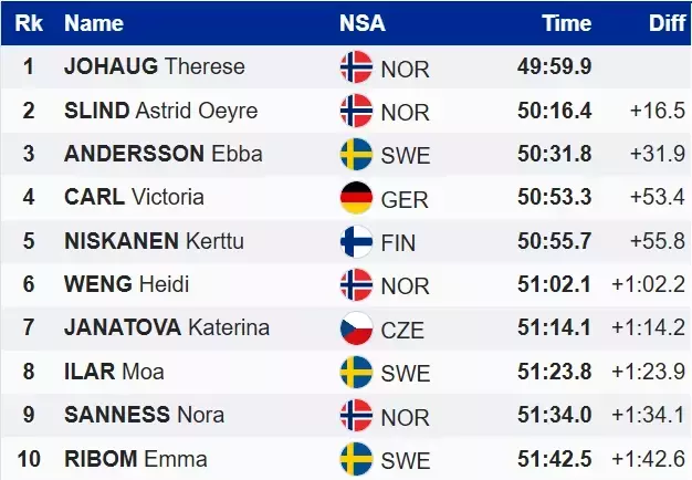 Легендарная лыжница из Норвегии Тереза Йохауг оформила 88-ю победу на уровне Кубков мира. Спортсменка на 16.5 секунды оторвалась от второй ступени. Также на подиуме оказались Астрид Слинд и Эбба Андерссон, финишировавшие на втором и третьем местах.