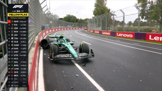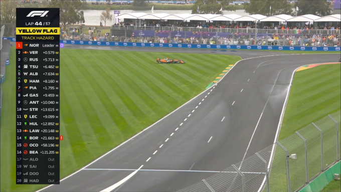 Когда казалось, что за победу будут сражаться гонщики Макларена, то сперва случился сейфити-кар из-за аварии Фернандо Алонсо, а затем снова полил дождь. И в такой ситуации с трассы на траву вылетел Пиастри, а пилоты и команды в панике начали думать, стоит ли опять переходить на дождевую резину.