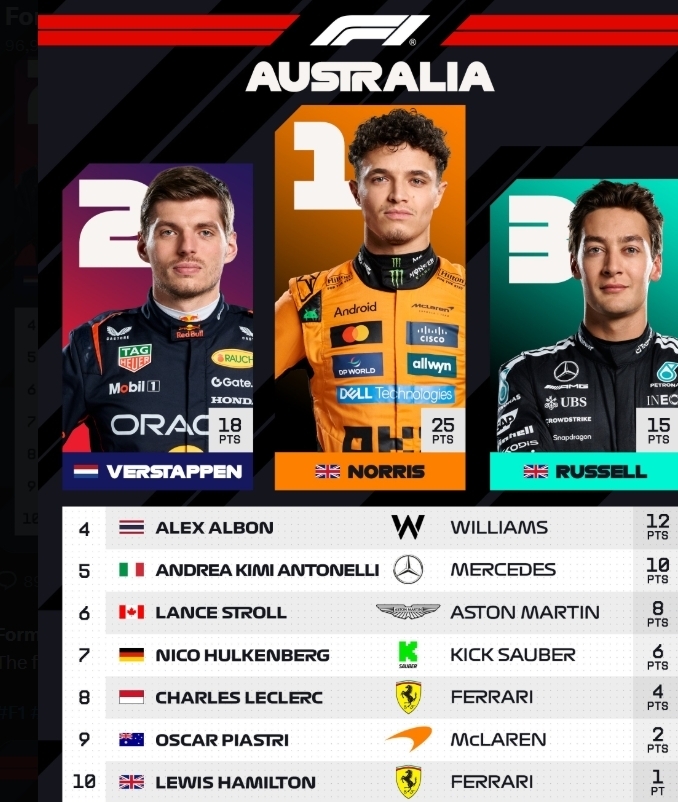 Состоялась первая гонка Формулы-1 в сезоне-2025, которая подарила нам интересную и хаотичную борьбу в дождевых условиях Гран-при Австралии. Победу одержал пилот Макларена Ландо Норрис, который опередил Макса Ферстаппена на Ред Булле и Мерседес Джорджа Расселла.