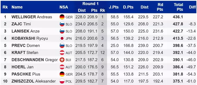 Вторую победу в текущем сезоне оформил немецкий участник Андреас Веллингер, завершивший соревнование, имея в активе 436.1 балла. Вторым стал Тими Зайц, которому для триумфа не хватило 8.3 балла. Тройку замкнул Анже Ланишек.