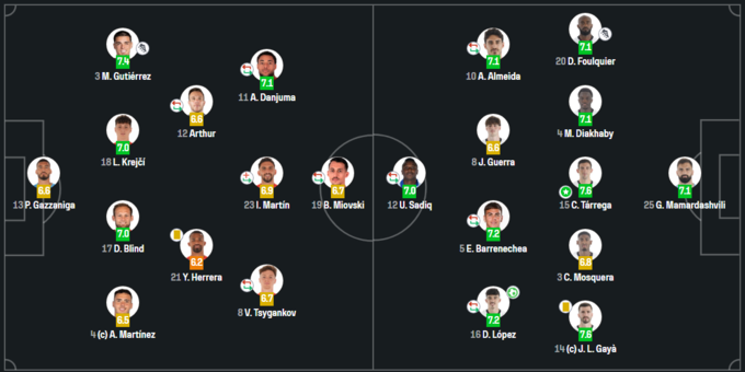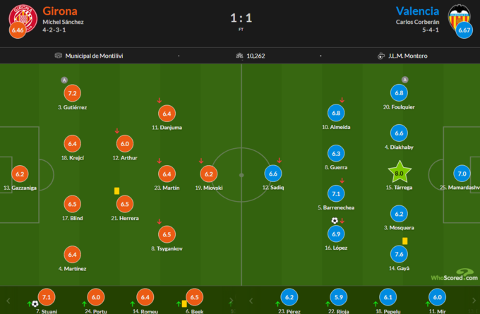 Украинский вингер «Жироны» Виктор Цыганков провел на поле 85 минут, результативными действиями не отличился. Статистический портал SofaScore оценил его игру в 6.7 баллов из 10 возможных. WhoScored дал Виктору оценку в 6.5 баллов. Оба портала признали лучшим игроком матча защитника «Валенсии» Сесара Таррега, оценив его игру в 7.6 и8.0 баллов соответственно.