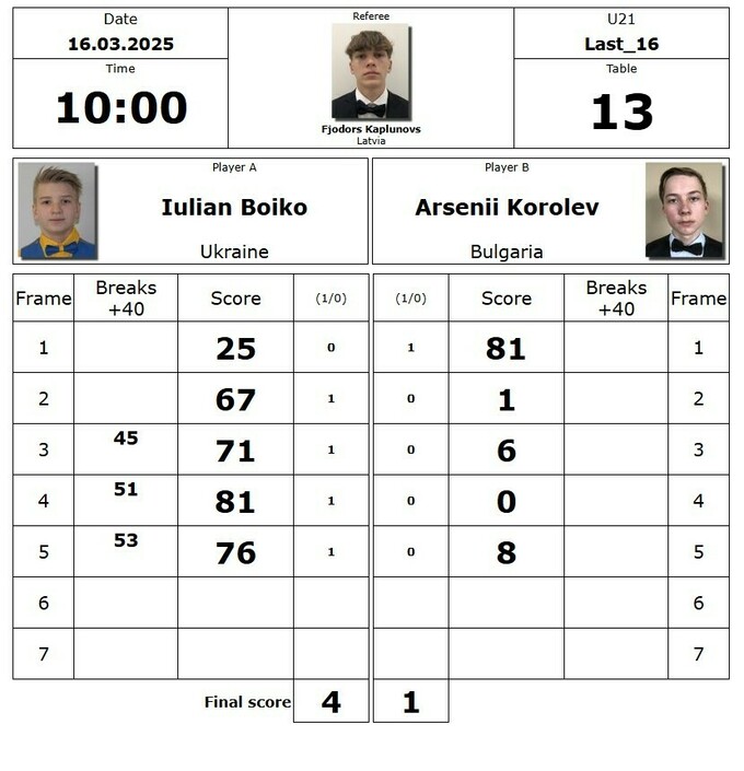16 марта в 09:00 в матче 1/8 финала ЧЕ U-21 Юлиан Бойко обыграл Арсения Королева из Болгарии со счетом 4:1