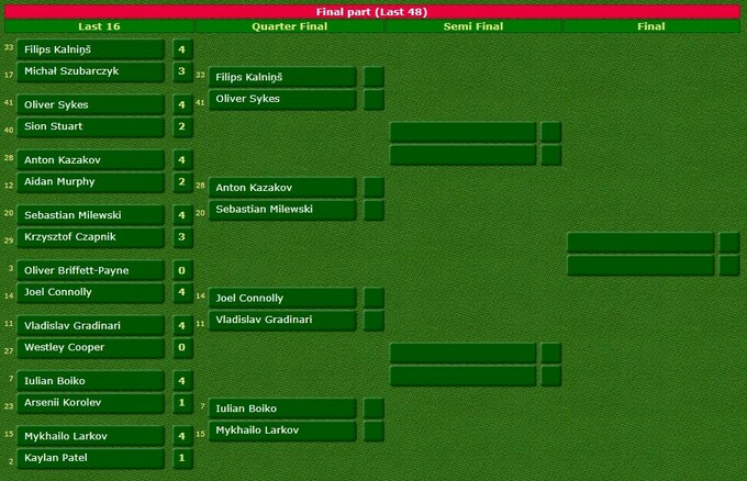 16 марта в 13:00 в матче 1/4 финала ЧЕ U-21 играют Юлиан Бойко и Михаил Ларков. Игра идет до 4 побед во фреймах.