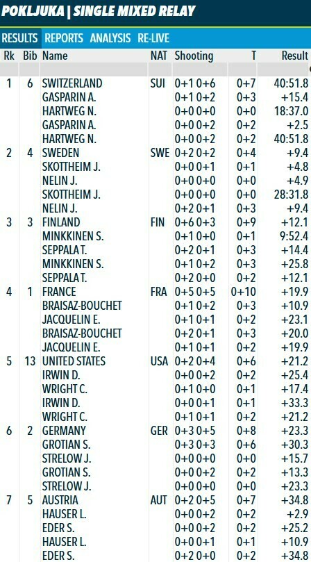 После последнего огневого рубежа небольшую сенсацию совершила сборная Финляндии, которая с пятой строчки поднялась на третью. На своем пути финский биатлонист Теро Сеппяля опередил француза Эмильена Жаклена и немца Юстуса Штрелова.