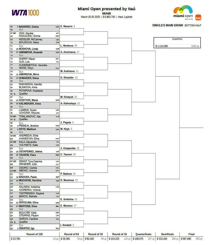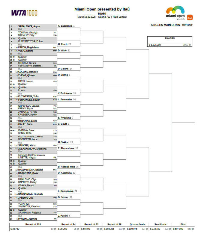 16 марта состоялась жеребьевка основной сетки хардового турнира WTA 1000 в Майами, США.