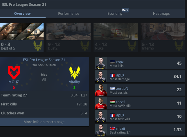 Серия началась на Dust2, где Vitality удачно использовали слабые места соперника, особенно на B-пленте. Они захватили преимущество 9:3, а финн Джими «Jimpphat» Сало завершил первую половину с всего одним фрагом. Во второй половине MOUZ смогли сократить отставание, но этого оказалось недостаточно – Vitality выиграли 13:9, несмотря на не лучший перформанс Маттье «ZywOo» Эрбо, который показал третий результат ниже 0.95 за год.