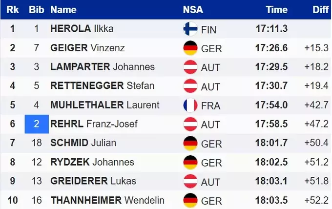 Впервые в своей карьере на первой строчке Кубка мира оказался финский спортсмен Илкка Херола, которому удалось оторваться от ближайшего конкурента на 15.3 секунды. Победитель предыдущего соревнования Винценц Гайгер занял вторую позицию, а вот Йоханнес Лампартер замкнул топ-3.