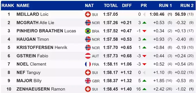Золотой дубль оформил представитель Норвегии Лоик Мейяр, выигравший перед этим гигантский слалом. Вторым финишировал другой норвежец Атле Ли Макграт, которому удалось подняться на три ступени благодаря второй попытке. В тройку лучших вошел уроженец Норвегии, а ныне спортсмен из Бразилии, Лукас Бротен.